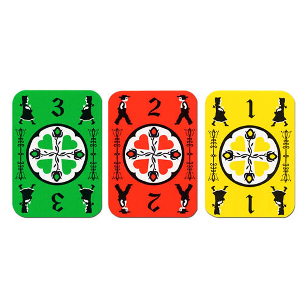 In Dutch Blitz, each player has her own deck of forty cards, with cards 1-10 in four colors; red and blue cards show a Pennsylvania Dutch boy, while yellow and green cards show a Pennsylvania Dutch girl. Each deck has a different symbol on the back to aid with card sorting between rounds.