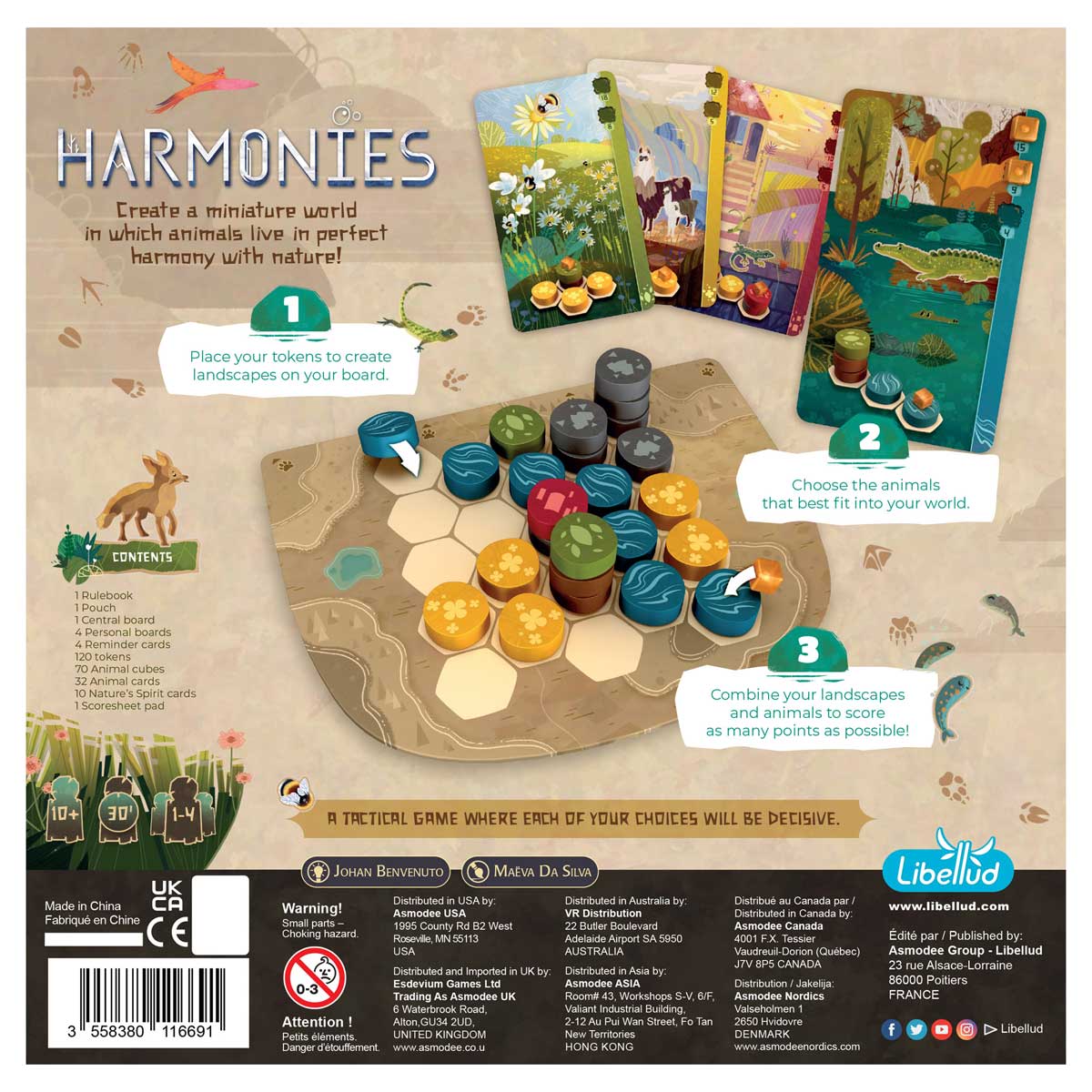 In Harmonies, create you personal landscape by placing coloured tokens. Create territories for animals and bring them to settle in your tiny world! Tactically combine your landscapes and animals to earn the most victory points and win the game.