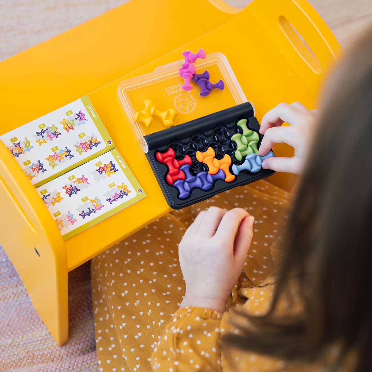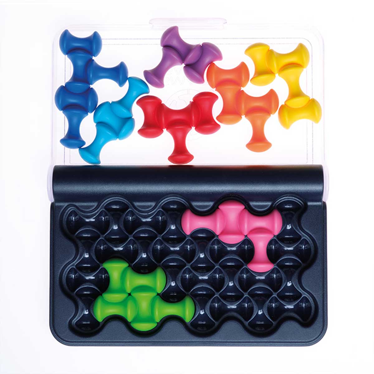 Choose one of the 120 challenges and fill the grid by placing the soft-touch puzzle pieces in the correct location and orientation.