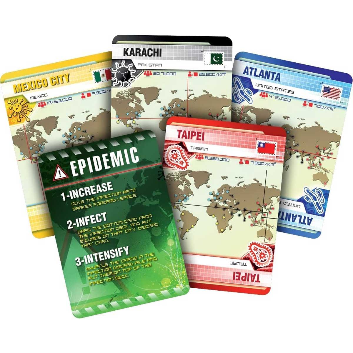 The game board depicts several major population centers on Earth. On each turn, a player can use up to four actions to travel between cities, treat infected populaces, discover a cure, or build a research station. A deck of cards provides the players with these abilities, but sprinkled throughout this deck are Epidemic! cards that accelerate and intensify the diseases' activity. A second, separate deck of cards controls the "normal" spread of the infections.