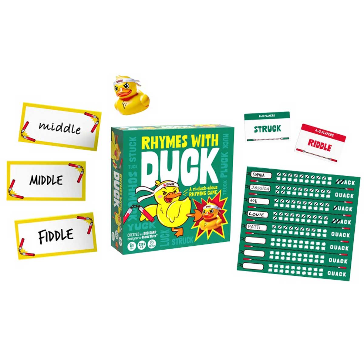 2. Players write a rhyming word attempting to score the most points by matching with only one other player and bonus points for matching with Chuck.